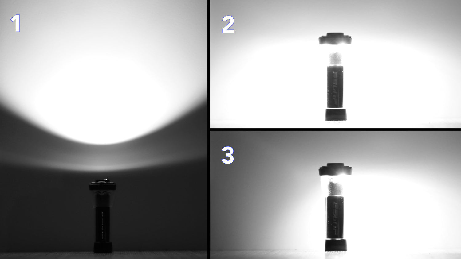 Passez d'un mode à l'autre avec un appui court sur le bouton ON/OFF. 1 : Torche - 2 : Ambiance 360° - 3 : Ambiance 180°